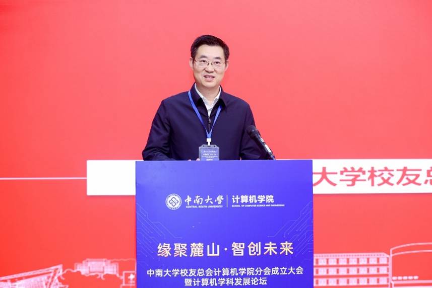 中南大学党委副书记付刚华致辞。他代表学校对计算机学院校友分会的成立表示祝贺,向校友介绍了中南大学的发展情况,并表示中南大学计算机学院自组建以来,始终瞄准国家重大战略需求和世界科技发展前沿,在人才培养、学科建设、科学研究等方面取得了显著成效,涌现出一大批杰出的学术人才和行业精英,为国家信息化建设和数字经济发展作出了重要贡献。各位校友在各自岗位上奋发有为,成就卓著,不仅为社会创造了巨大价值,也为母校赢得了广泛赞誉。最后指出,校友分会的成立是凝聚校友力量、助推学校和学院发展的关键一步,希望分会成为:凝聚人心、传承精神的“连心桥”;协同发展、共创未来的“助推器”;反哺母校、共襄盛举的“加油站”。