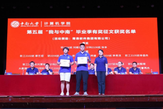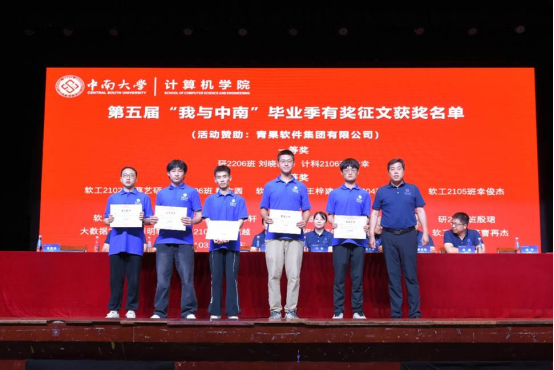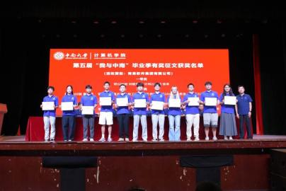 夏日的中南,草木葱茏,离歌渐起。6月20日上午,中南大学计算机学院第五届“我与中南”毕业季有奖征文活动颁奖典礼在潇湘校区信息楼顺利举行。计算机学院副院长夏佳志宣读了获奖名单,学院党委书记赵晓霞、大数据研究院院长龙军、计算机学院党委副书记王新辉分别为一、二、三等奖获奖学生颁奖。