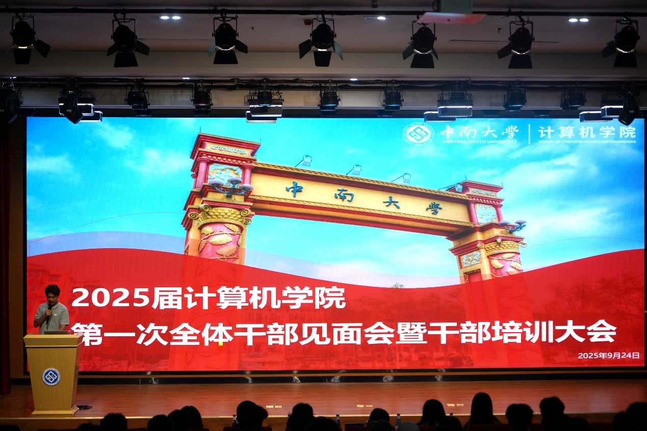 2025年9月24日,中南大学计算机学院在信息楼108会议室召开2025届第一次全体干部见面会暨干部培训大会。学院党委副书记王新辉,团委书记陈司宇,大学生朋辈心理互助会指导老师周清菡,大学生科学技术协会、院学生会指导老师刘家忱,学业发展与服务中心指导老师宋晓萌,宣传专干赵赫及学院各学生组织干部共同出席本次活动。大会由院学生会办公室主任王嘉诚主持,通过指导讲话、经验分享、组织介绍及专题培训等环节,为新学期学院学生工作高质量开展奠定坚实基础。