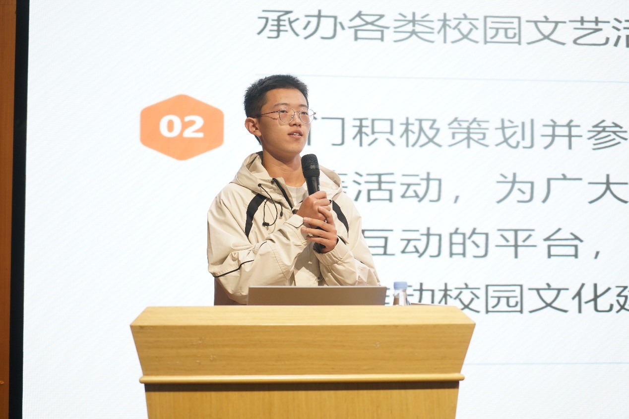 团委学生会作为学院学生工作的核心力量,各部门分工明确、协同联动。团委学生会各部门代表轮流上台,介绍了办公室、生活权益部、体育部、文艺部、青志协、宣传部、组织部、社会实践部以及社团部九大部门的职能。