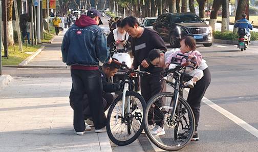 登山途中,支部党员遇到一对携幼童的夫妇,其骑行的自行车突发车链故障,夫妇二人因不便处理而面露难色。见状,支部党员主动上前提供帮助:多名党员分工协作,有的蹲身调试车链,有的协助扶稳车辆、安抚幼童,仅数分钟便解决了故障。这一细微举动,将革命先辈“全心全意为人民服务”的宗旨,转化为了贴近群众的实际行动。