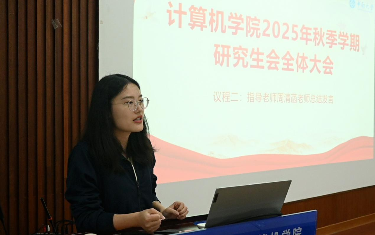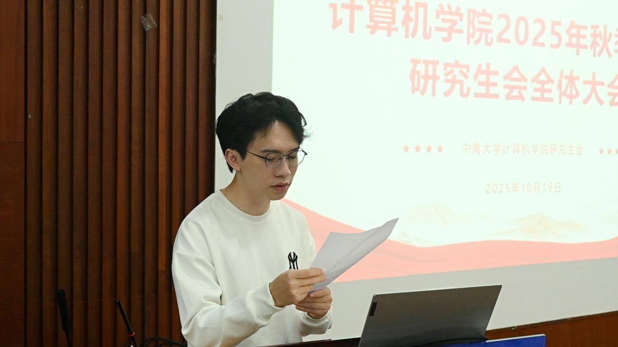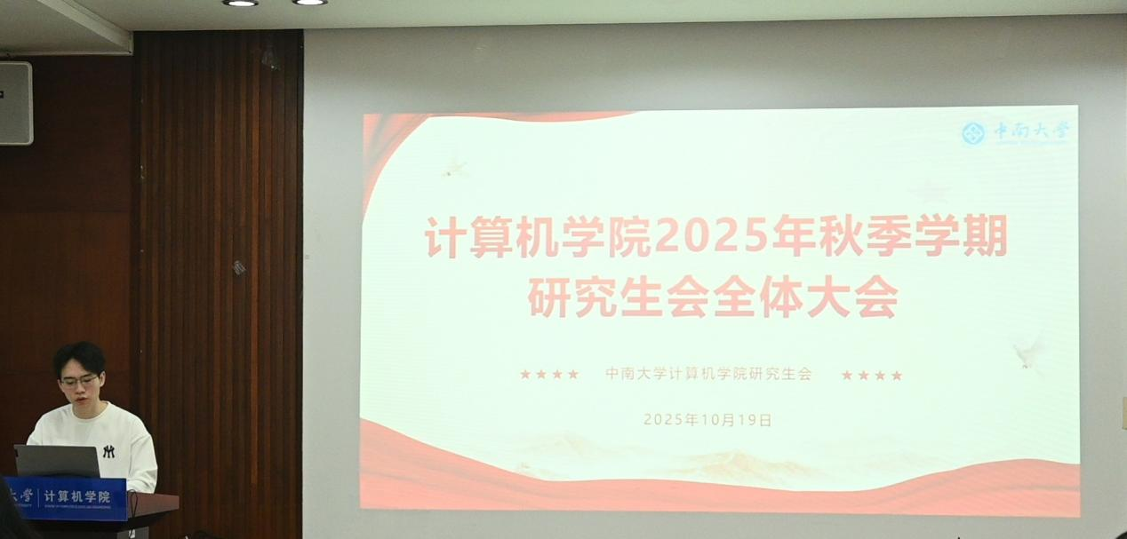 为推动新学期各项工作顺利开展,2025年10月19日下午,计算机学院研究生会(以下简称“研会”)2025年秋季学期全体大会在计算机楼313召开。会议由研会主席徐韬纬主持,邀请计算机学院党委副书记王新辉、研会指导老师周清菡出席并指导工作,全体研会成员参加会议。