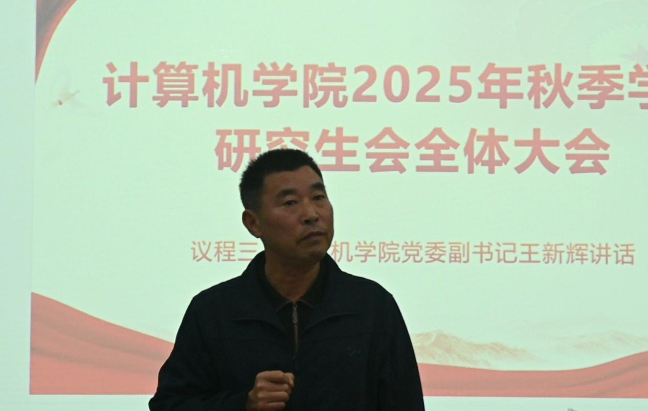 大会第三项,计算机学院党委副书记王新辉发表讲话。王书记强调,学生干部应注重细节、廉洁自律,明确“服务者、桥梁、助手、修行者”的四重定位。他结合学院学科建设与学生发展实际,提出“前瞻性思考、全局性谋划、系统性推进”的工作要求,鼓励研会围绕挑战杯、大创等重点赛事,联动博士群体形成合力,助力学院学科建设不断突破。在讲话中,王书记以诗寄意,勉励同学们在文字中体悟责任与坚守,从诗意中汲取奋进的力量,不断提升自我、勇担时代使命。